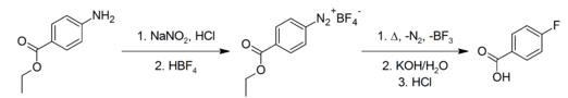 4-Fluorobenzoic acid is commercially available. It may be prepared via the Schiemann reaction, in which a 4-aminobenzoic acid, protected as the ethyl ester, is diazotised and then fluoride introduced using tetrafluoroborate. Hydrolysis of the ester converts it back to the free acid.
